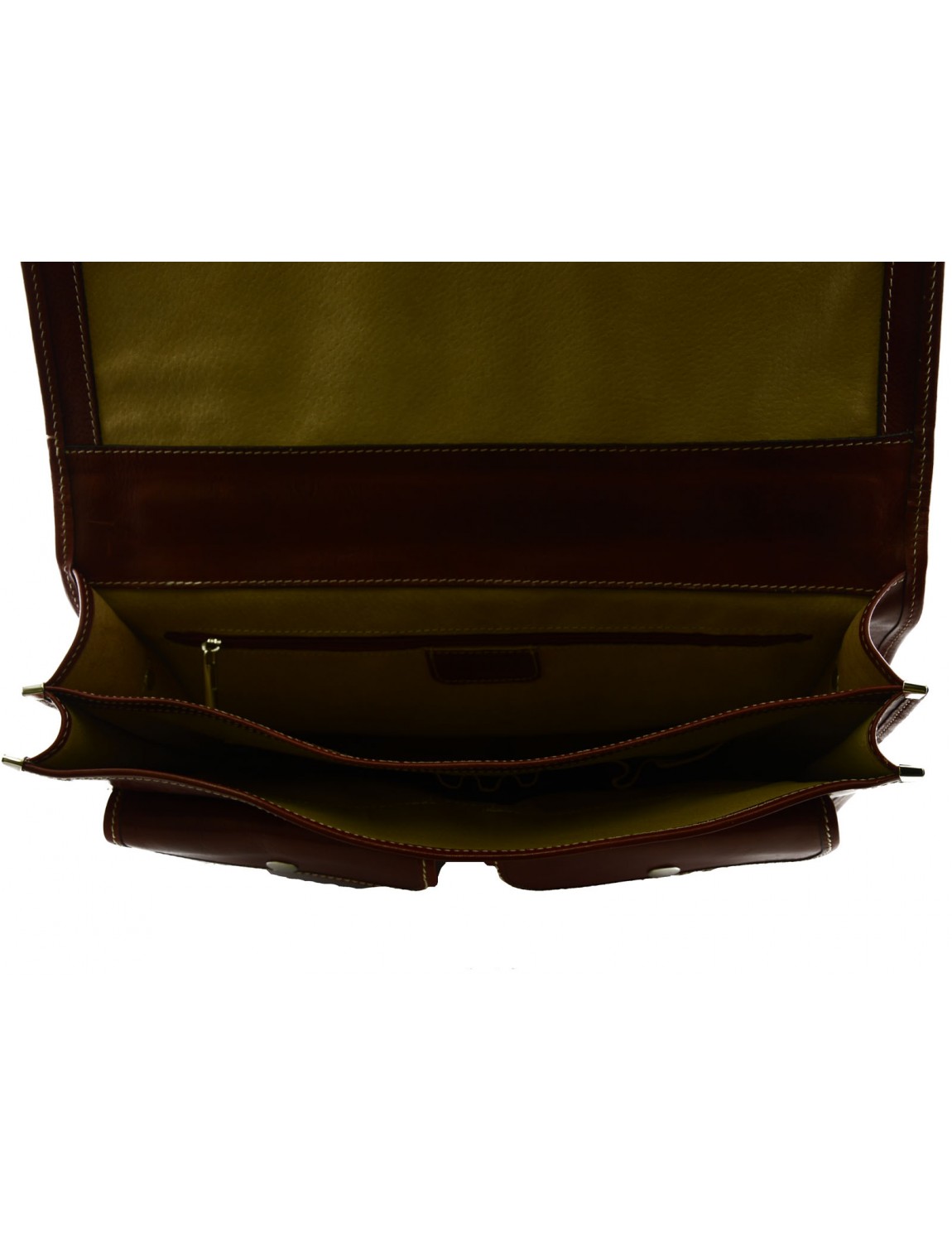 Aus 100% Made in Italy echtem Leder. Diese Aktentasche besteht aus zwei Abteile mit inneren Fächern, hat einen essentiellen und Liearen Design, und hat zwei große inneren Fächern für die Speicherung von mittelgroßen Objekte, um Ihre Gegenstände besser und funktioneller zu organisieren. Der Messingfarbene Druckknopfverschluss vergibt ihr einen Vintage-Look.