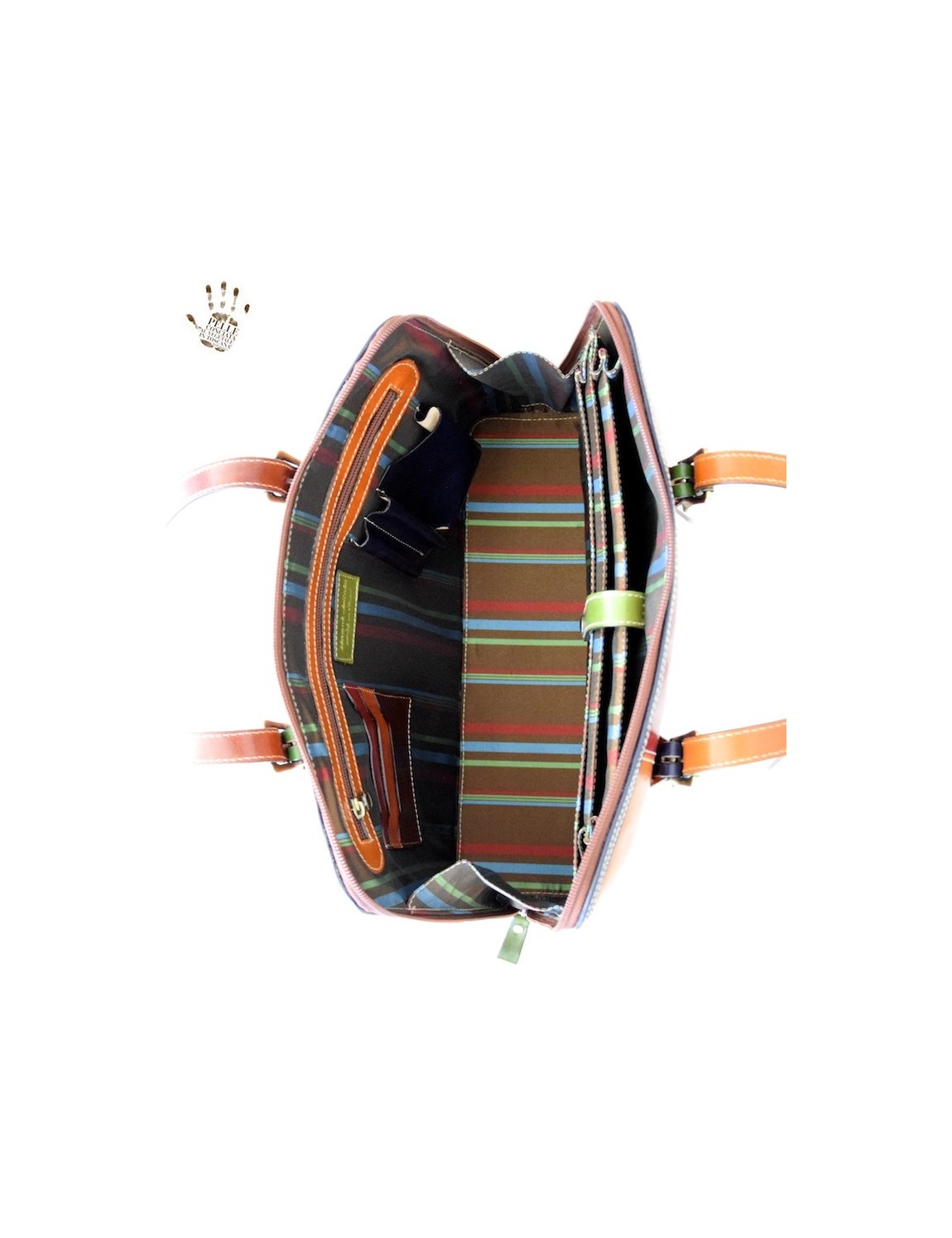Genuine 100% made in Italy leather shoulder bag for ladies, vegetable tanned and hand buffered, with a linear design but brightened on the outside by multicoloured leather. The interior is characterised by various compartments and a colourful lining.
