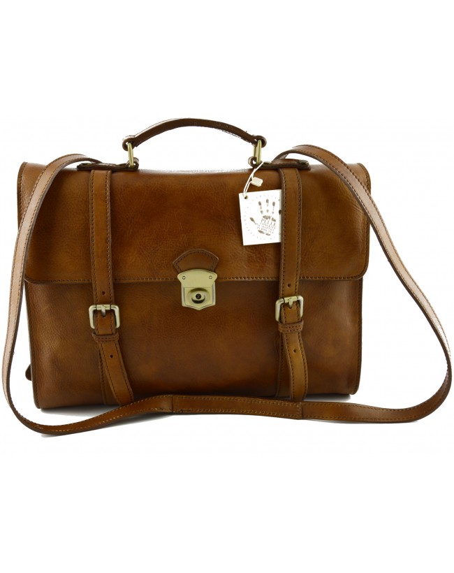 Cartable en cuir véritable au tannage végétal et tamponné à la main, 100% Made in Italy. Design rétro; bandoulière réglable; portable comme un sac à dos.