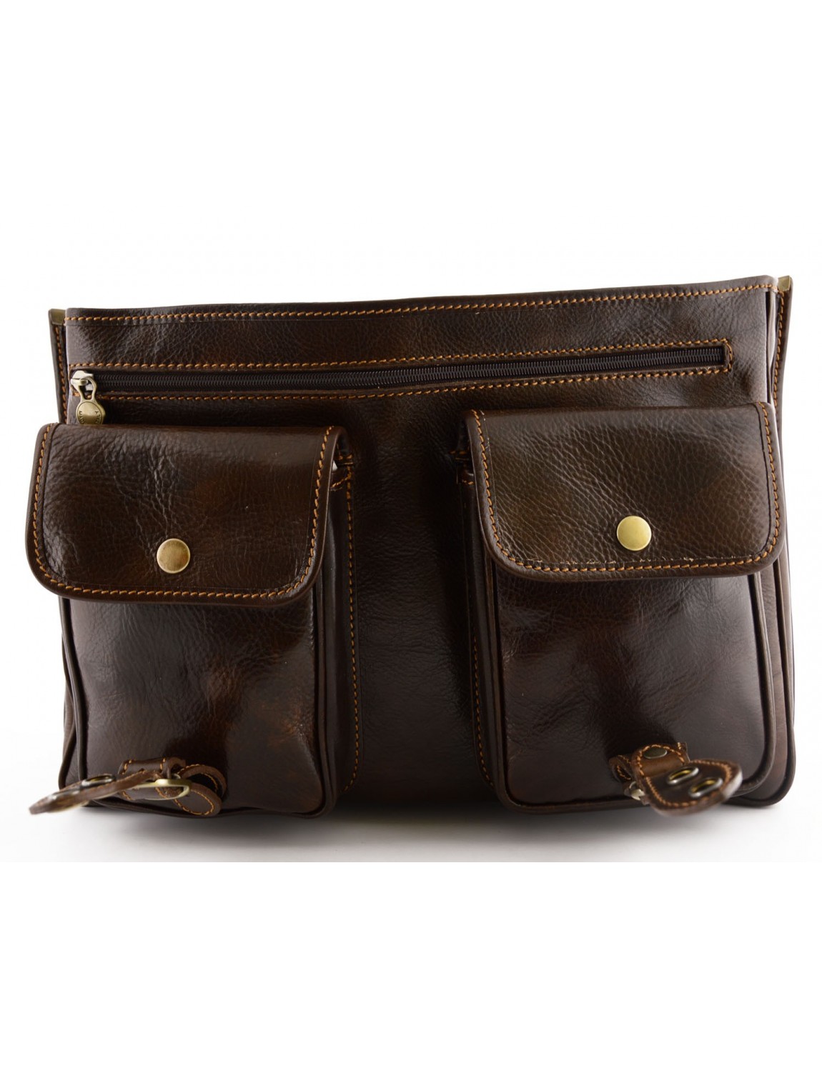 Vera pelle Made in Italy tamponata a mano. Organizzata con pratiche tasche anteriori con bottoni a pressione, internamente lavorata al naturale e suddivisa in due ampi scomparti con porta carte/penne/cellulare.